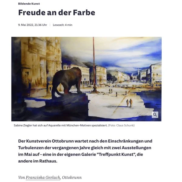 Ende Februar meldete sich unverhofft eine Kollegin und Freundin bei mir. Sie fragte nach, ob ich nicht mit ihr zusammen im Kunstverein Ottobrunn ausstellen möchte. Das war natürlich ein Angebot, da konnte ich schlecht nein sagen. Zu zweit eine ganze Galerie zu bespielen ist toll. Franziska Polzer-Foreman arbeitet so ganz anders als ich. Sie schafft Coudragen aus Stoff. Ihre Werke sind zart, verspielt oder auch sehr intensiv. Unsere Werke können wunderbar nebeneinander hängen. Sie harmonieren einfach gut. Wir hatten insgesamt 35 Werke gehängt, davon waren 18 von mir. Es war endlich einmal genügend Platz meine Serie von München Aquarellen auszustellen. Sehr gefreut habe ich mich über einen Artikel in der Süddeutschen Zeitung.