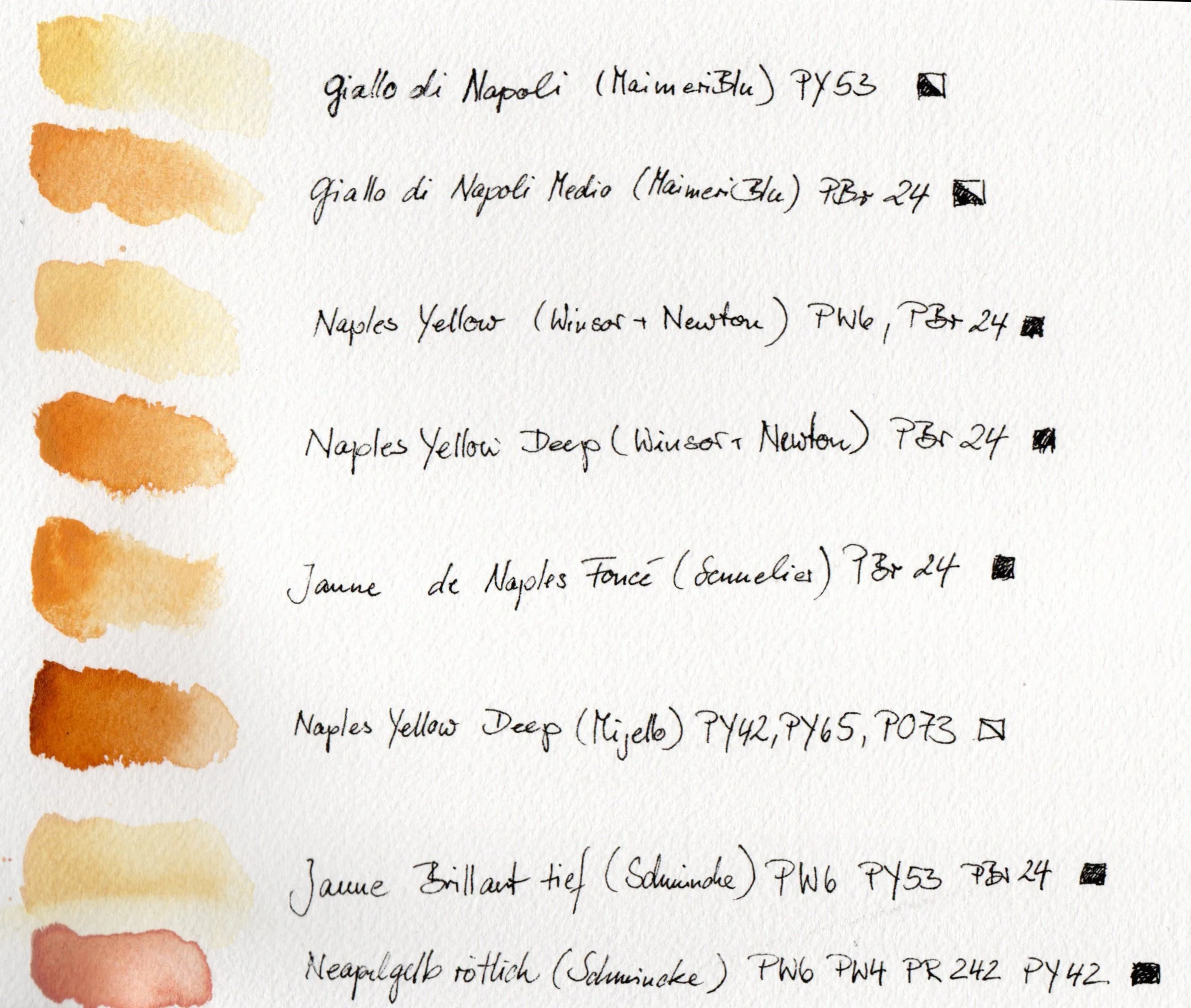 Neapelgelb auch Antimongelb ist ein gut deckendes Pigment aus Bleiantimonoxid – PY 41. Ähnlich wie Siena, Umbra und Ocker gilt Neapelgelb als Tertiärfarbe und erweitert die Palette der Erdpigmente. Der Name tauchte zum ersten Mal im 17. Jahrhundert auf – giallolino di Napoli. Man könnte meinen, dass es aus Neapel stammt, evtl. am Vesuv abgebaut wurde. Seine Herkunft hat aber nichts mit seinem Namen gemein. Bleiantimonatgelb wurde schon von den Alten Ägyptern und auch in Mesopotamien verwendet. Es war wegen seines Farbtons sehr beliebt. Allerdings stellte ich fest, dass das Gelb bei jedem Hersteller anders aussieht, nicht aus demselben Pigment besteht. Vielmehr handelt es sich oft um eine Farbmischung. Daher habe ich auch die verschiedensten Neapelgelb-Farbtöne ausprobiert.